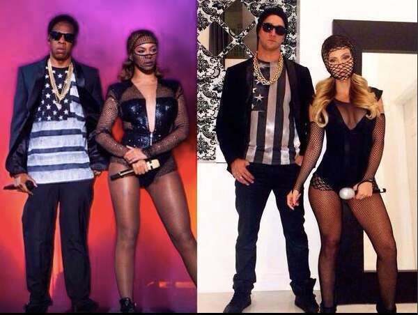 The white couple on the right chose a distinctive look when dressing as Jay-Z and Beyonce, so that the costumes would speak for themselves.