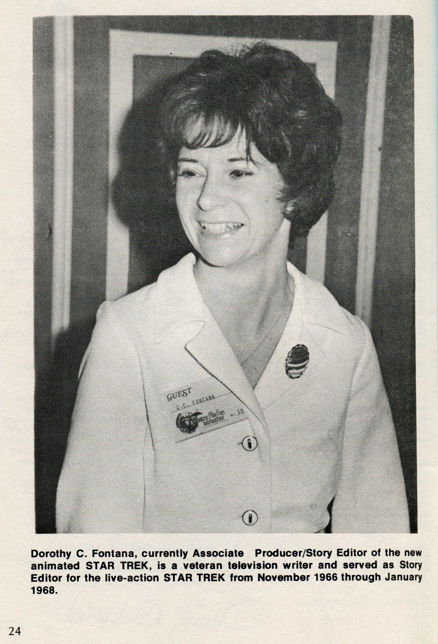 By 1973, Star Trek had arrived at San Diego Comic-Con, as it was known for the first time that year. The animated series had just been announced, and there were hopes for a feature film. A letter from writer David Gerrold, best known for “The Trouble with Tribbles,” appeared in the program, asking fans to write polite letters to NBC and Paramount in support of the new show and potential film. Attending in person to promote the series was producer and story editor D.C. Fontana. Fontana was a hugely prolific writer for the original Star Trek and other television series, responsible for “Charlie X,” “Friday’s Child,” and “Journey to Babel,” among others. To fans she was a mega-star, bringing their beloved show back to television screens. Imagine Joss Whedon turning up at a small local convention to promote Serenity, three long years after the death of Firefly; that’s about the level of love fans had for Fontana at that time.