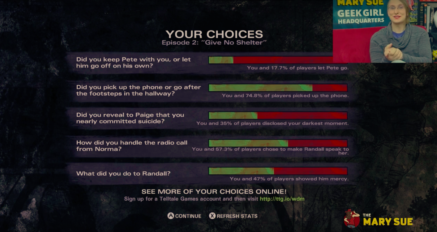 That’s where Chapter Two ends, with Michonne leaving Randall tied up but still alive. Just before the credits roll, Michonne gives us a final ominous monologue. Then, we get to the best part of the credits: getting to see which choices everybody else made, compared to ours!