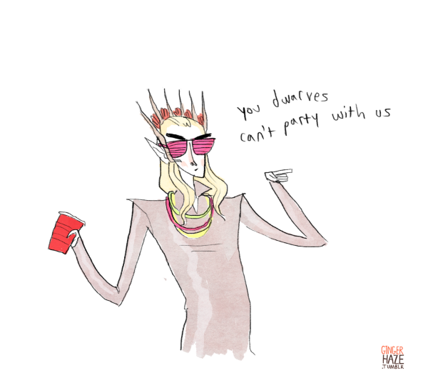 Oh. Speciesist Party Dad Thranduil wants me to tell you that The Desolation of Smaug is actually named after one of his dance moves. Whatever you say, Speciesist Party Dad Thranduil. Just stop embarrassing your kids.