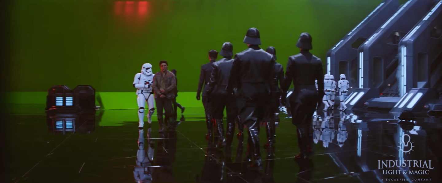 Of course, there are lots of examples in the video of times when the creative team did use CGI to render several of the vehicles in the movie, such as the spaceships. Lots of the interior spaceship sets did get built, but the insides of the bigger ones (like the Imperial Star Destroyer) have been supplemented by some green-screen backgrounds to add in additional details. From the outside, most of the spaceships don’t exist at all; you can watch the visual effects team put together the scene where Finn watches the TIE fighter collapse into the sand on Jakku. That was all done in post; in the real world, John Boyega had to react to a green screen.