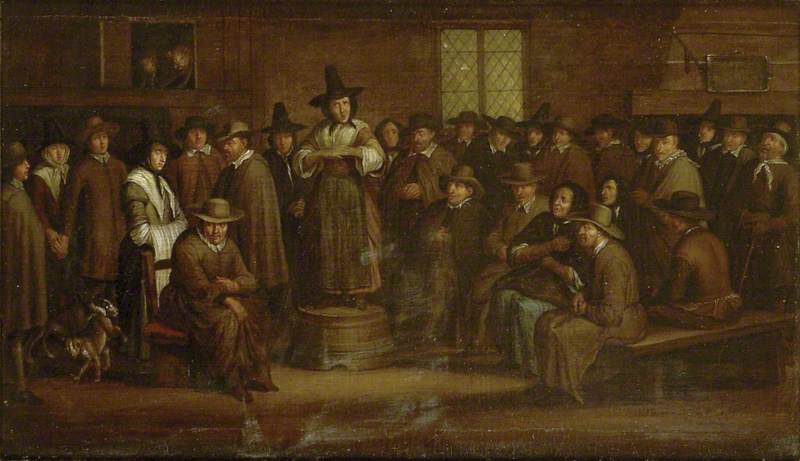 At the same time as the Quakers were gaining publicity, they were adopting the fashions of the day and their own distinct looks. And that involved … tall, black, conical hats with large brims. As you can see in this painting of a Quaker meeting in the 1670s.