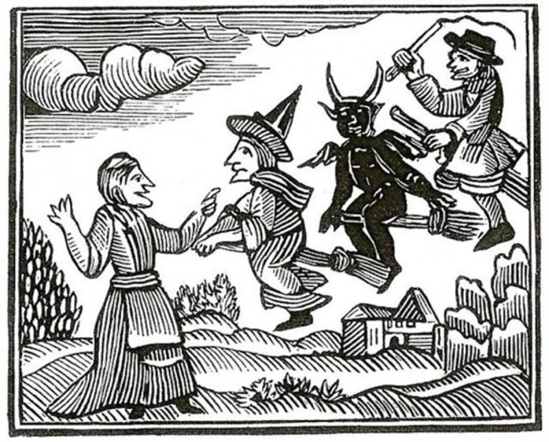 The first witch we see depicted with her famous pointy hat is from this woodcut, date to around 1720, long after the quaker hats were out of fashion.