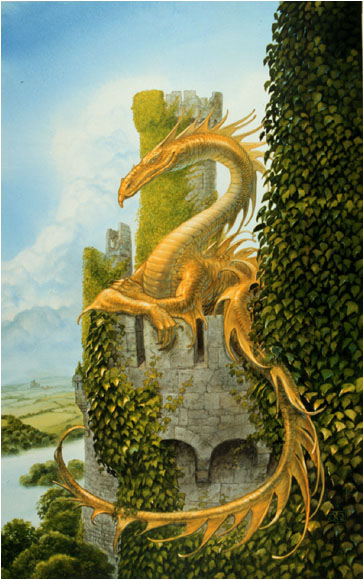 See, what we have above is Smaug the Golden, by John Howe, one half of the duo of fantasy illustrators who’ve created all the creature and armor concepts for The Lord of the Rings movies and are back to work on The Hobbit. Note the pointy face and floppy, frilly spines. Here’s another of Howe’s dragons:
