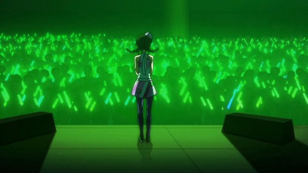Yet the message of The idolm@ster is always a positive one in the end: that the life of an idol is worth all the hardships. There is always something to remind the idols of what they loved about idoldom. Ritsuko, former idol turned producer, is encouraged by her old fans when she has to fill in for an idol in the group she’s managing. From her perspective, we see how a small group of devoted fans with green glowsticks colors the whole room green to make it look like the entire audience is cheering her on.