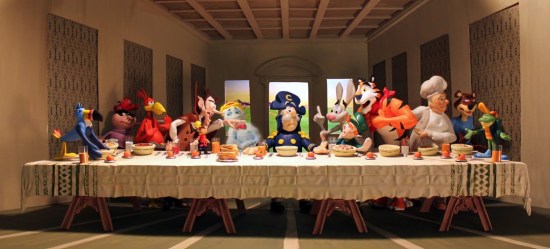 Sculptor Brian Stuckey shows us all just how important breakfast cereal mascots are with this sculpture. The scene took him over three months to build, and he points out that the table is over thirty-eight inches long, which means the scene doesn’t exactly fit inside a shoebox. Click on the image to see a larger version.