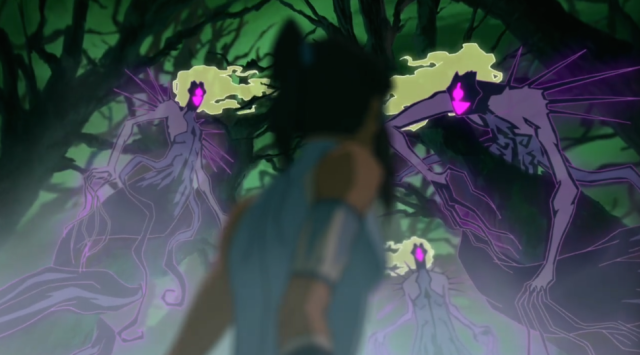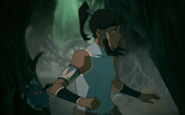 A little Jonah-in-the-belly of the whale action separates our intrepid explorers, and Korra finds herself in a dark forest in the company of Fabio spirits