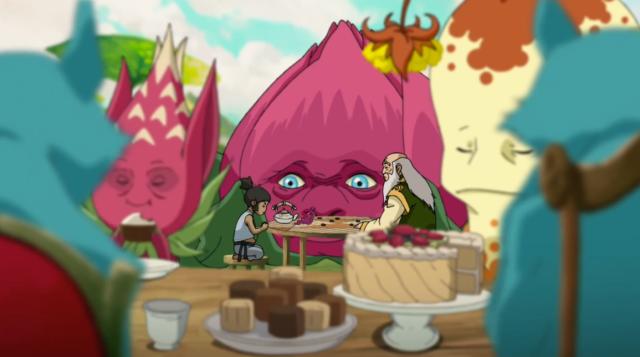 Iroh, who decided he wanted to live his afterlife in the spirit world because of course he did, takes Baby Korra to a spirit tea party, because of course he does. He serves her spirit cakes and spirit tea and explains to her that, if she wants to find Jinora, it might be a good idea to first help the phoenix spirit she injured find its home, because … spirit logic, I guess.