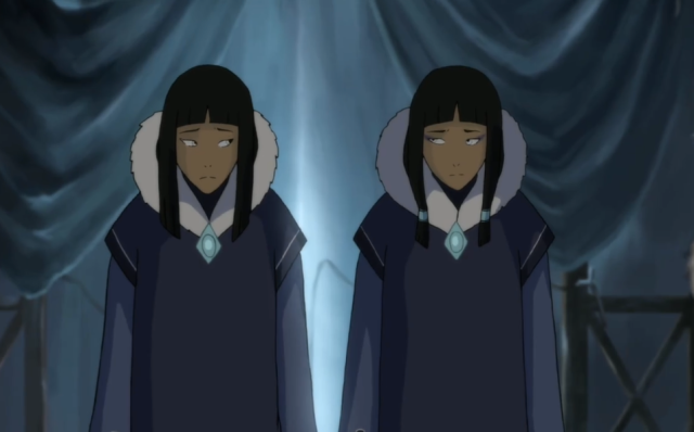 The twins, hearing all this, are a little freaked out, and understandably so. Their dad A) wants to take over the world and B) is completely willing to give up his human side to do that. After Unalaq leaves, Korra unsuccessfully tries to enlist their help. Desna tells Korra that his father is wise, and if he says what he’s doing–a.k.a. abandoning Desna and his sister–is right, he believes him. It’s a sad moment. Jesus fucking Christ, there is more child abuse on this show… Eska and Desna aren’t ready to turn on Unalaq yet, but they’ll get there. It’s early. It took Zuko almost three seasons!