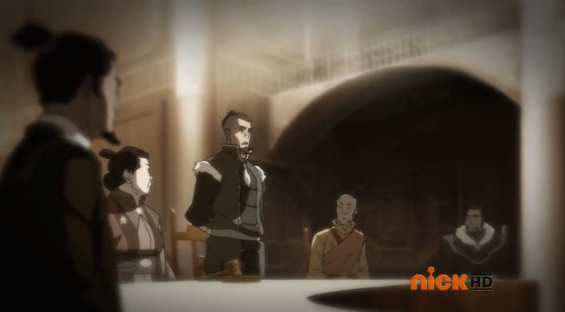 (Quick summary of the other stuff: There was one this Republic City crime bigwig called Yakone [the requisite Clancy Brown character, not that I am complaining], who could bloodbend whenever he wanted to, not just at the full moon. There was a trial, and the council—led by SOKKKA!—found him guilty. Yakone lost his shit and bloodbent everyone in the room, including Aang, so he could get away. Aang breaks free and gives chase, and Yakone bloodbends his wrist and leg until they break, which is pretty fucked up. Aang goes full Avatar state and removes Yakone’s bending, which is a skill he still has after using it in the ATLA finale against Ozai.)