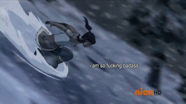 Korra, unable to bust herself out of the box, decides, Fuck it, I have nothing better to do, I guess I’ll meditate and try to figure out what Aang wants to tell me. In a flashback, we see