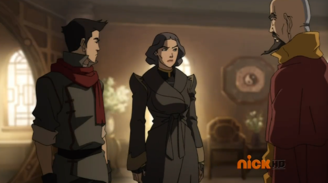Asami, her bullshit-o-meter set to “on,” asks Bolin whether Mako likes Korra, and the physical embodiment of a golden retriever admits that they did kiss that one time. Asami is displeased.