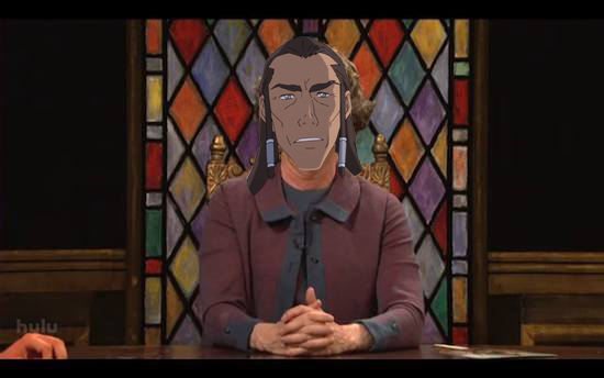Later on, at a feast in Unalaq’s honor, tensions rise: Unalaq wants to poach Korra away from Tenzin so he can teach her about spirits. Tonraq objects. Korra’s pissed off at being micromanaged her whole life. Varrick’s just concerned with his otter penguins. I made this photoshop of Unalaq as the Church Lady, because it works surprisingly well.