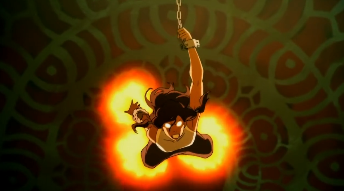 Despite a valiant effort, she does eventually switch into Avatar state, after which she proceeds to break free from her shackles and absolutely wail on Zaheer and his buds BECAUSE SHE’S THE FUCKING AVATAR AND SHE’S IN BEAST MODE. He thought their just-kill-the-Avatar-when-she’s-locked-up-it’ll-be-fiiiine plan would be SO. EASY. Pssht. Libertarians, man.
