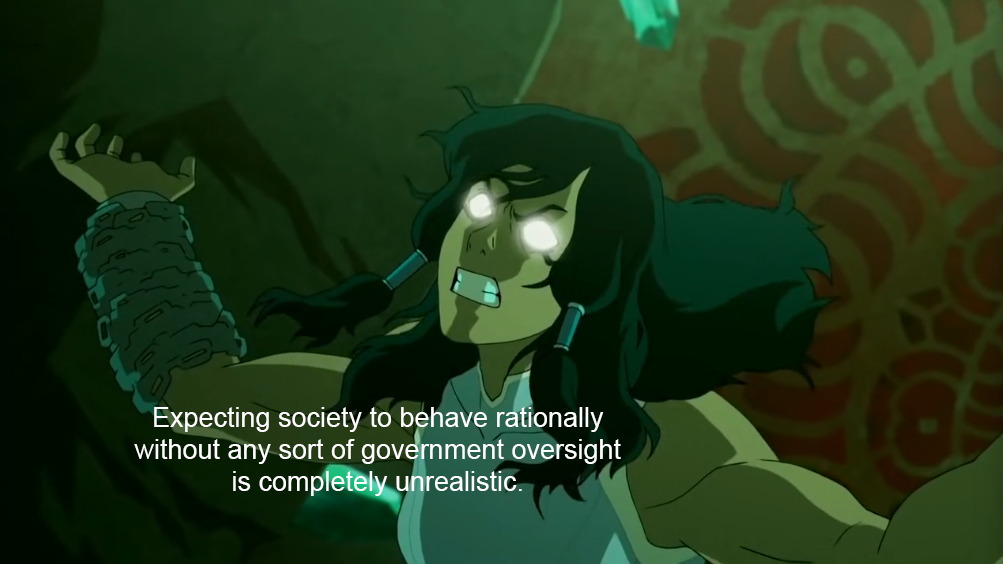 Eventually—as we know they must—Bolin and Mako defeat their villainous counterparts. Mako takes out Ming-Hua by electrocuting her with lightning. (Did he … have that skill before? “Electrocuting the minion with water for arms” seems like it would have been the thing to have done episodes ago if Mako already knew how to generate lighting, but his reaction to finally offing her was less “Wow, a new thing I couldn’t do before!” than “Hmm. OK.”) Ghazan just lavas the whole place and essentially commits suicide, hoping to take Mako and Bolin with him (he fails), because “I’m not going back to prison.” Zaheer’s all like ANARCHY BLAH BLAH BLAH RULE OF THE PEOPLE BLAH BLAH BLAH DOWN WITH WORLD LEADERS BLAH BLAH BLAH. And then there’s Ghazan: “Revolution I guess, but prison food just really sucks, y’know?” Ghazan only joined the Red Lotus to impress Ming-Hua and secretly doesn’t think Hillary Clinton is all that bad. I am convinced. So let it be written!