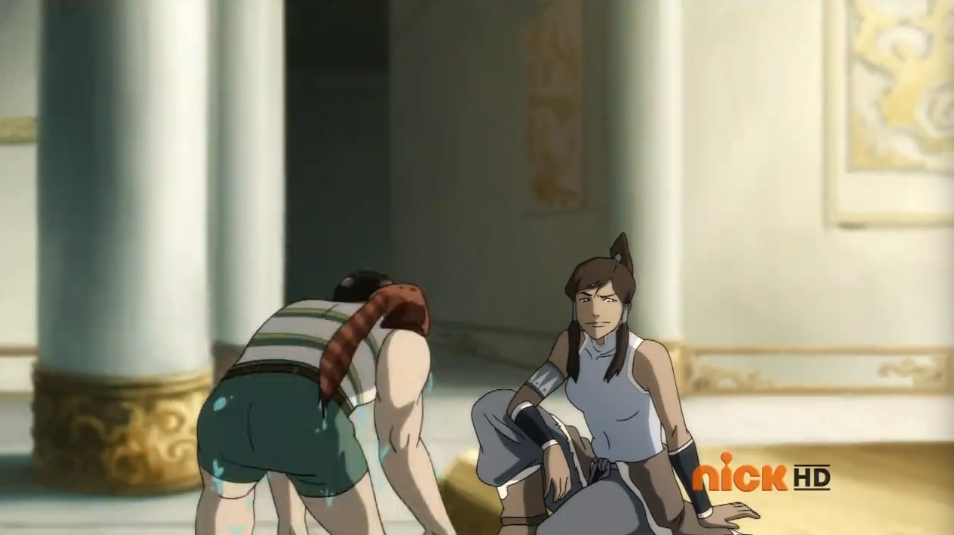 Korra visits Asami’s fancy mansion, where Bolin’s really loving the high life and Asami says something that makes Korra literally make the :| face.