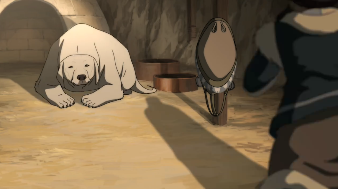 One of the White Lotus chaps is wary about how Korra likes beating dudes up a little too much, but Katara steps in and convinces him to let Korra learn airbending from Tenzin. Only when Tenzin rolls in on a flying bison—three kids and a pregnant wife in tow—it turns out he’s only staying overnight, because he has Shit To Do in Republic City. (Miscellaneous item: Aang and Katara’s other kids were named Kya, after Katara’s mom, and Bumi. Awwww.) Korra tries to convince the White Lotus to let her go with Tenzin, but they refuse, which isn’t a big deal, because literally everyone has to know she’s going to escape on her GIANT POLAR BEAR DOG: