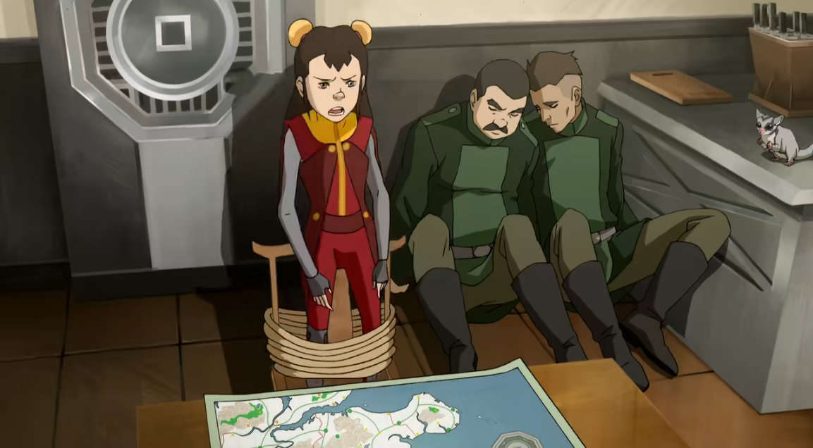 Ikki is discovered by a pair of Earth Nation Empire guards, who arrest her because under the rule of Queen Bitch Kuvira, no one from outside the Earth Nation Empire is allowed on Earth Nation Empire lands. The two guards, upset at being left behind to guard empty land, reason that if they hand Tenzin’s kids over to Kuvira, they might get a promotion.