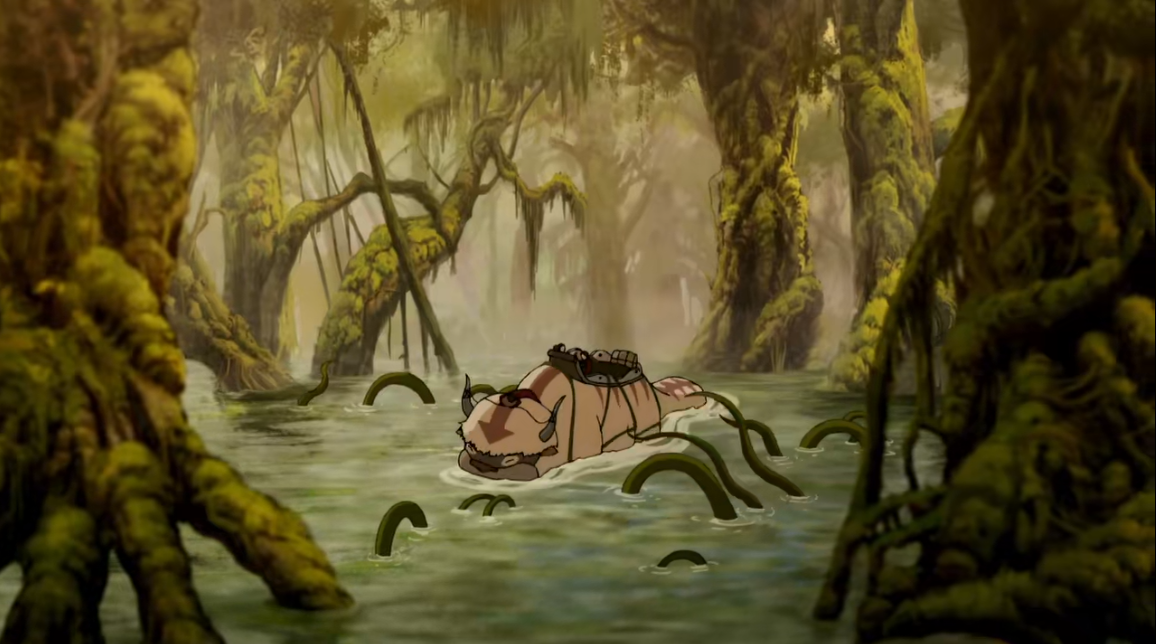 By this point, the guards have pointed out to Ikki that pretty much everywhere in the surrounding area is mapped except a big-ass swamp. Jinora and Meelo show up to rescue Ikki, who pretty much had shit on lockdown anyway. Though Jinora still can’t sense Korra, Ikki convinces her siblings to check out the swamp anyway; it being a spiritual place, Korra might have gone there. While flying over the swamp, the three siblings and their trusty air bison Pepper are dragged down by some sentient vines. Into DAGOBAH.