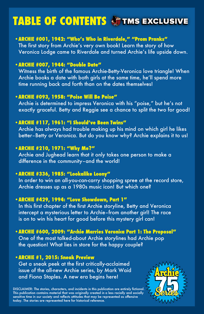 BEST OF ARCHIE COMICS: 75 YEARS, 75 STORIES is a 640-page collection featuring essays on Archie and the gang and stories from every era of Archie history. Take a peek at some of the pages below: