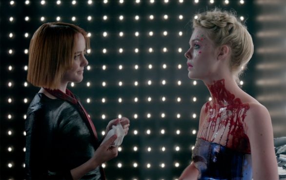 The Neon Demon opens with Elle Fanning’s character, a 16-year old named Jesse, posed in high fashion makeup and clothes, sitting with her neck completely bloody. We immediately cut to her cleaning up and through a conversation with a friendly makeup artist named Ruby (Jena Malone) we learn Jesse is an orphan who just moved to a shady Pasadena hotel to be a model. Ruby brings Jesse to a party and we also meet models Sarah (Abbey Lee) and Gigi (Bella Heathcote). Gigi’s defining feature is that she’s the “bionic woman”—AKA loves cosmetic surgery—and Sarah has an accent and a snarky attitude.