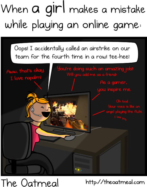 Yesterday, Matthew Inman‘s The Oatmeal was embroiled in the quickest of internet controversies: he published a comic that’s purpose was to illustrate his personal experience that female gamers who are playing badly don’t get called out on it by their male teammates, while when he screws up, he is “eviscerated” with foul language and threats of violence. Naturally, this particular perspective on online gaming culture, particularly in first-person and third-person shooter culture, doesn’t skew with most female gamers’ experience, or, at the very least isn’t the dominant trend in their experiences. And many people told him so. After clarifying his intentions when writing the comic, and the presumably hearing from a lot more people, Inman apologized, admitted the comic was “stupid” and made a significant donation to a worthy, gender-related charity.