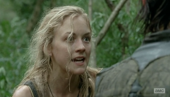 “I need a drink,” Beth says. She means alcohol, because apparently she’s never tried it. Girl, I know you are lying: nobody who’s never had a drink before ever has that powerful a desire for one, even in the middle of a zombie apocalypse. Daryl doesn’t respond, so she decides to wander off for no discernible reason. Then, a bunch of walkers come after her because of course they do, and she does a pretty successful job of leading them away before Daryl finds her and drags her back to their “suck-ass camp.”
