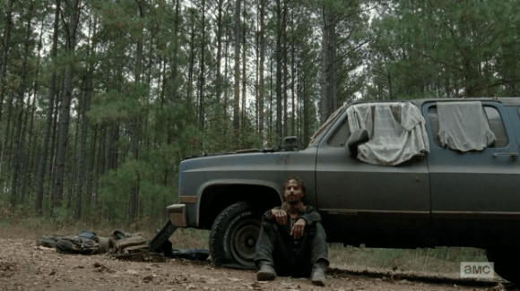 Rick goes to stab his first walker, and all of a sudden he wakes up. He’s actually hunched over next to a broken down truck. He also has blood caked on his face. Great! That’s not foreboding or anything!