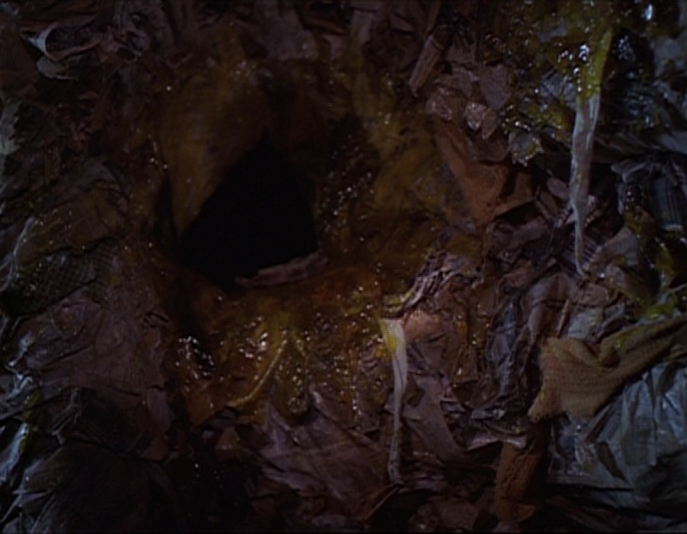 She and Mulder go to see the investigating officer from 1933, who’s now in a care home. He remains haunted by the crimes and shows them his book of evidence, which includes a photo of Eugene from 1963 in which he looks exactly the same as he does now. He also has the same address for him as the one Mulder’s dug up, so they make this their next port of call. They find a dank, dilapidated apartment which has clearly been abandoned for some time. A hole in the wall leads down to a cellar, which hides a seriously disgusting nest-type thing in the corner. It’s made from bits of rag and paper and reeks of bile. Cue Mulder’s line of the episode: “Is there any way I can get it off my fingers quickly without losing my cool exterior?”