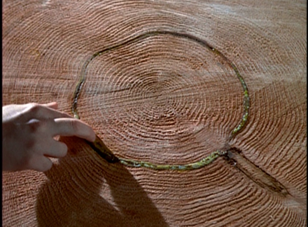 Larry’s taken a sample from the tree so they head back to the cabin to take a look. He discovers that it contains moving bug creature things. Mulder theorizes that, as tree rings are essentially a historical record of climate and rainfall patterns, a major climactic event could have caused a mutation which in turn resulted in the bugs. A volcanic eruption, in particular, would have released huge amounts of radiation and could have either mutated an existing species or released something long dormant from within the Earth. Spinney backs him up, saying no one was attacked til the tree was cut down.