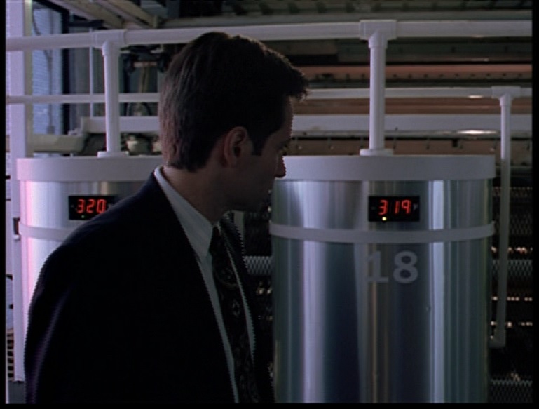 Another member of the project, Keats, bites it when his head is drowned in liquid nitrogen. This may be worse than death by jet engine. Roland is the culprit, but before he attacks Keats we see him having visions of the killing in his sleep. In the course of investigating, Mulder and Scully learn that someone else logged onto the computer after Keats died and kept working on the research file. The user logged in under Grable’s name, and the password turns out to be a combination of numbers Roland had been scribbling on the paper Mulder took as a sample. Hmm.