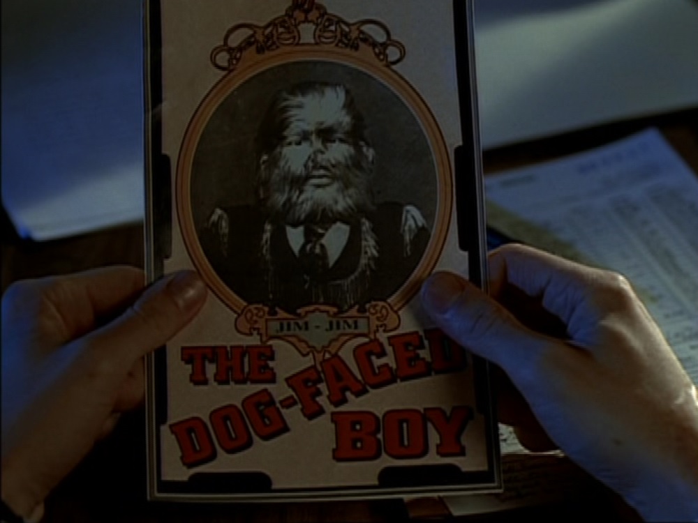 They later learn Gollum is what’s called a “geek” and he’s known in the community as the Conundrum. Apparently he will eat anything, live or dead, creature or object, organic or no. You can already see where this is going. Scully’s sleuthing turns up a picture of a performer named Jim-Jim the Dog-Faced Boy whom they later discover to be the sheriff in a past life. There’s some discussion of how they shouldn’t suspect someone just cos he used to be excessively hairy, and they follow him at night to discover him burying a potato. THIS EPISODE IS SO EFFING WEIRD.