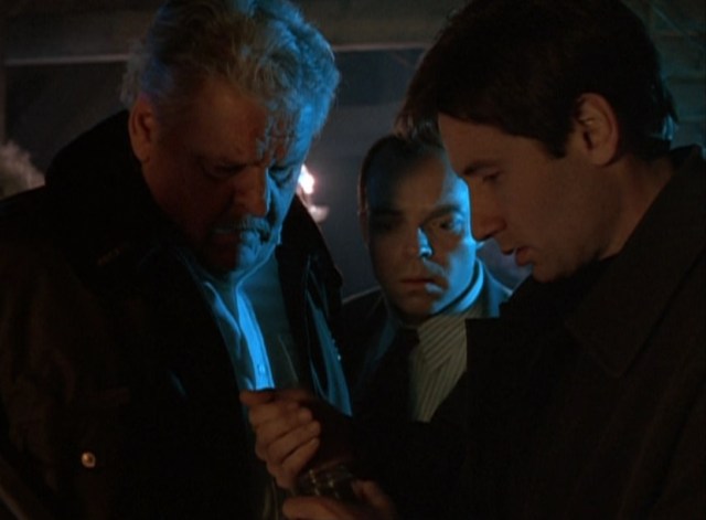 The creature disintegrates in his hand, turning to some kind of metallic powder. Everyone’s puzzled. A doctor looks Mulder over and asks what the hell’s going on. He wants to know if the town’s in danger and if he should evacuate his family. Mulder says he can’t advise him on those points. The sheriff comes in and the doc excuses himself, saying that after speaking to Mulder he feels slightly constipated.