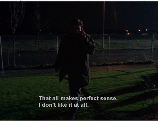 Scully was reading Breakfast at Tiffany’s during her down-time, just so we all know. Also, I love that these two have so little in the way of social lives outside of their work that when their phone rings they immediately know it’s the other one without having to check. It’s like in that episode of Friends where someone knocks on the apartment door but all six of them are in the room so they’ve no idea who it could be. In the world of The X-Files, there can be only two.