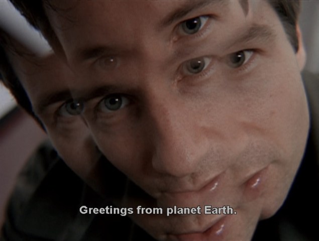 Bambi has a theory that UFOs are insect swarms. Mulder listens, fascinated, professing his admiration for her scientific detachment. Scully calls back and is hung up on immediately. I think we have a live one here, folks. Mulder later wakes up in bed and just as I was wondering if he got some action from a human woman for once, he calls Scully and reveals himself to be entirely on his lonesome. (Which is kind of a shame, cos he’s looking pretty fierce right now.) Scully, who’s been sleeping with the phone next to her bed, answers straight away. Mulder relates a story from when he was a child, climbing a tree when a praying mantis frightened him. Its head resembled an alien. The mysteries of the natural world were revealed to him and he was repulsed. Truly, Fox Mulder had the most traumatic childhood of all time. The things he’s seen. The revelations he’s had. What can it all mean.