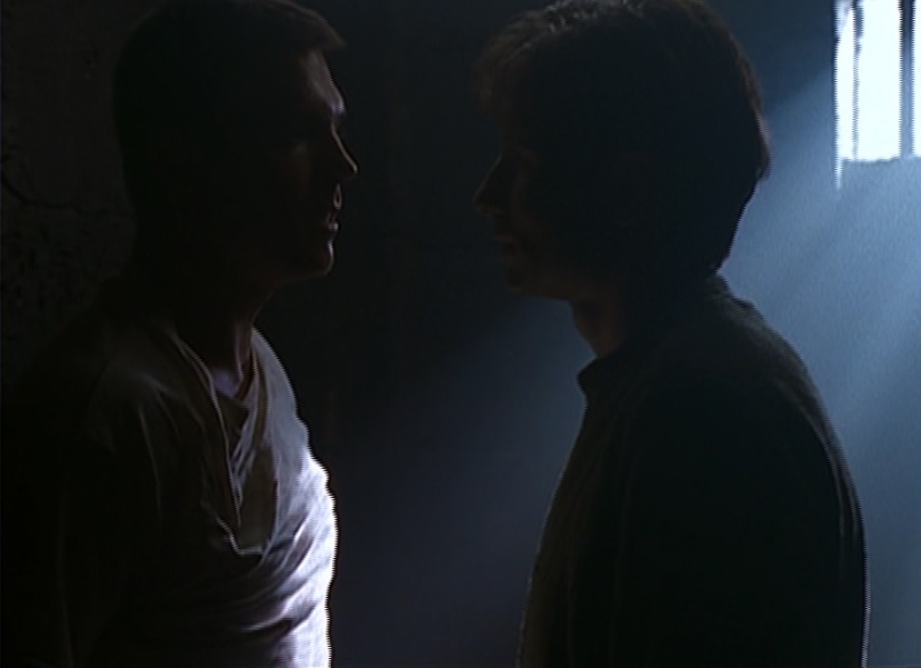 Off they go to Tunguska, thumbing a lift to the crater site. Krycek keeps whining about Mulder keeping him in the dark, as if the event which occurred there back in the day weren’t completely common knowledge. I know this is a pre-Wikipedia universe but seriously, Alex, do some reading. They cut under a barbed wire fence and find a bunch of people digging in what looks like a mine. Men on horseback patrol the area and quickly stumble across the two of them, capturing and imprisoning them in a rank jail cell. When Mulder first comes to, he’s alone, but because this is an American television show there’s a helpful prisoner in the next cell over who just happens to speak perfect English and is only too willing to provide portentous exposition. Later, Krycek is thrown in with Mulder. There’s more fumbling, more punching, Alex finally tells Mulder not to touch him again and they end up staring at each other menacingly while breathing out the exasperation. I’m not amplifying ANYTHING here, guys. The eye contact alone would set you on fire.