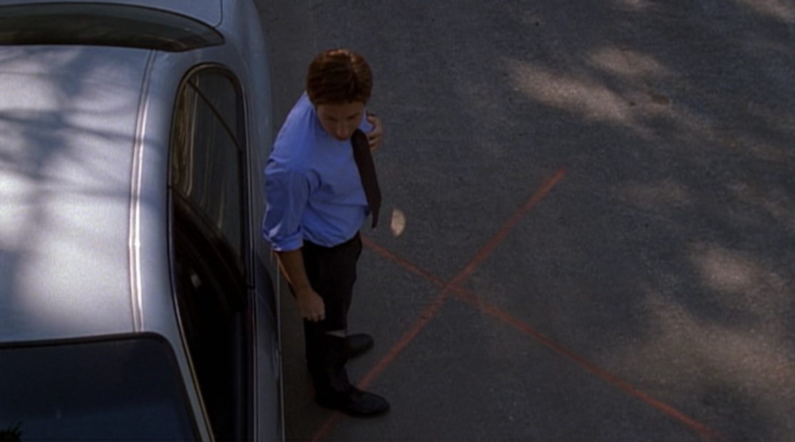 In it, our heroes are summoned back to Oregon and the scene of the very first abductions they investigated, way back in the pilot. They’ve been dealing with an auditor in DC who’s querying their travel and work expenses. This auditor guy suffers from a fatal deficiency of craic and Mulder may or may not punch him in the face at some point, so Scully’s only too happy to “go waste some money” when they get a call from Billy Miles. (Side note: Scully gets progressively more laid back and light-hearted as this season progresses, and it is lovely to see.) Some kind of craft has supposedly crashed in the woods and a deputy’s gone missing. The X Mulder drew in the middle of the road all those years ago is still visible when they arrive. [sings “The Way We Were”]