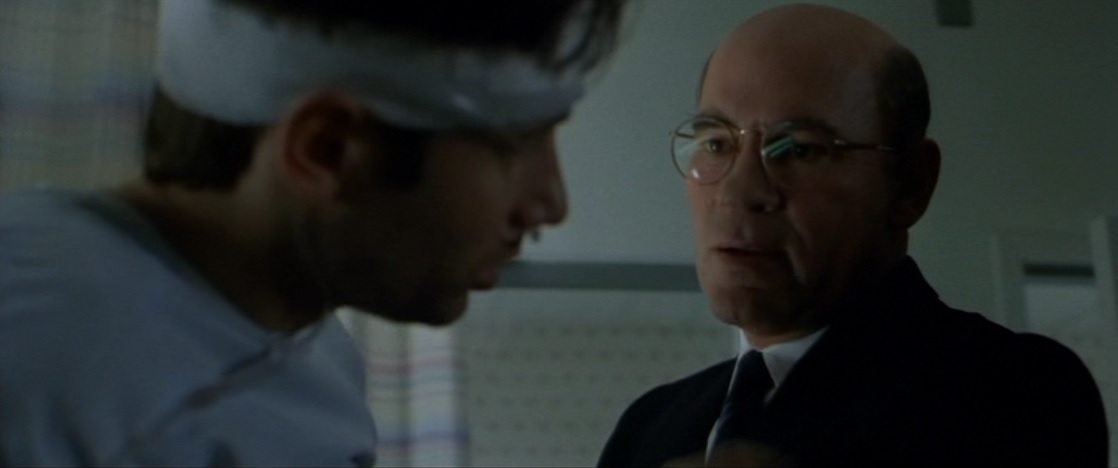 Mulder wakes up in hospital. The Lone Gunmen are leering over him, but it’s OK cos Skinner’s there too.