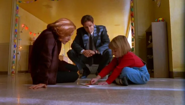 Scully convinces Kresge to order an autopsy on Roberta’s body. The examiner finds a needle puncture on her heel, suggesting the anaesthetic drugs were injected and the suicide might have been staged. Kresge, at Scully’s behest, opens a murder investigation. They trawl through the Sims’ house for evidence. A needle is found in the trash, which Marshall says is for Emily. The child needs daily injections due to a severe form of anaemia. Scully sends it to the lab for testing and notices the two men Marshall was “meeting” a few nights back watching from a car.