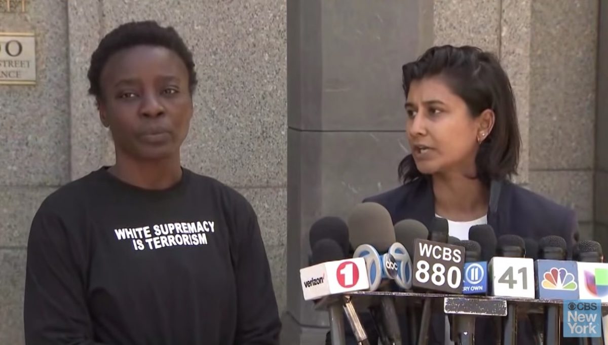 Okoumou was part of the Rise and Resist members who had hung an “Abolish I.C.E.” banner from the statue earlier in the day and decided to climb the statue independently of the group. With her lawyer Rhiya Trivedi, Okoumou spoke outside a New York courthouse about her status as a naturalized United States citizen from the Democratic Republic of Congo and the goals of her protest. Trivedi introduced Okoumou: