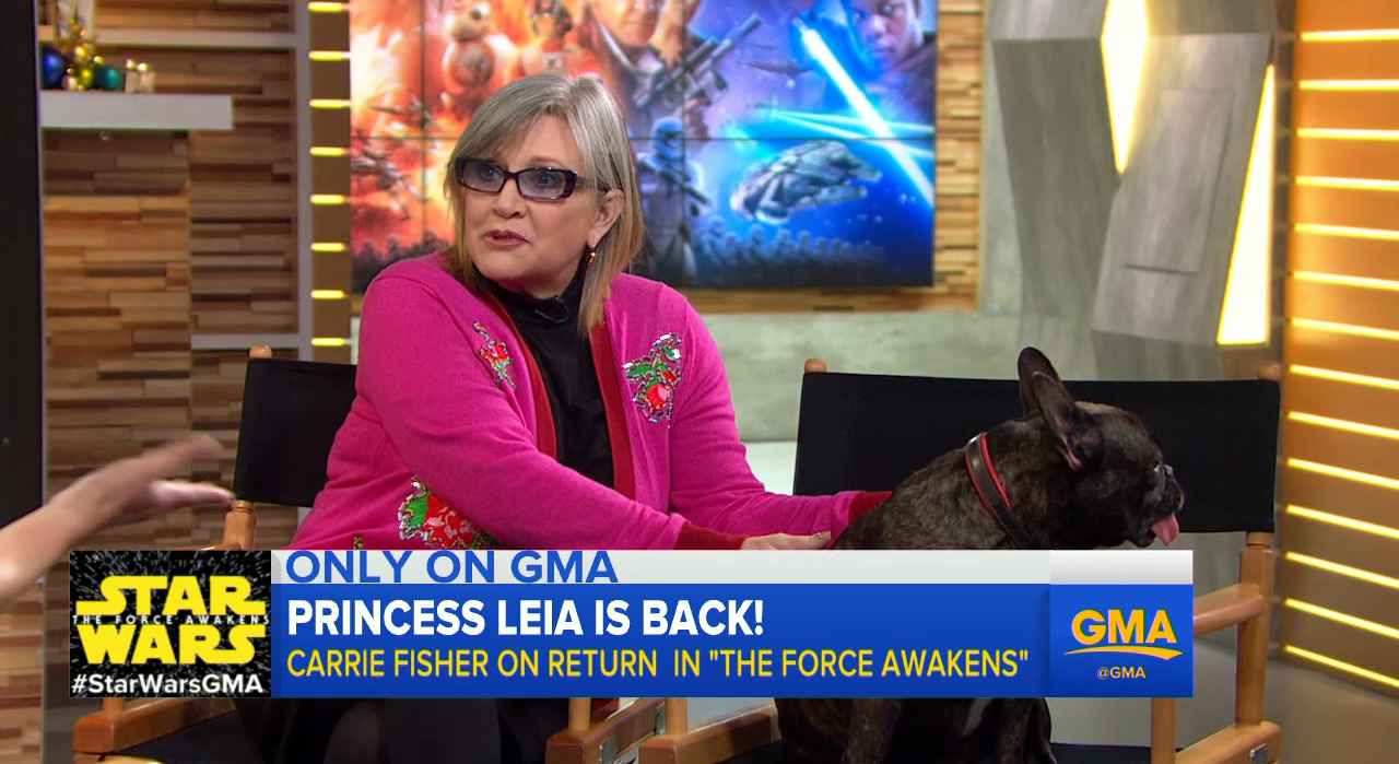 Everyone else needs to just take note because they will never pull off an interview with as much class and sass as Carrie Fisher does in this Good Morning America segment about The Force Awakens. She completely side-stepped the question about losing weight for the film–and best of all, her beloved dog Gary made an appearance and completely stole the show at the end. HERE COMES THE GENERALLLL. (via HitFix)