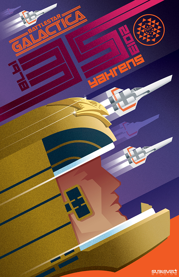 This art deco BSG poster by Sublevel Studios is just plain gorgeous. Check out one more (Cylon!) at Geek-Art.
