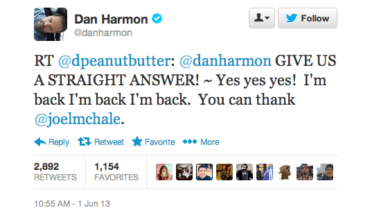 Dan Harmon tweeted confirmation today of the negotiations apparently going on earlier in the week. He’s back with NBC’s Community