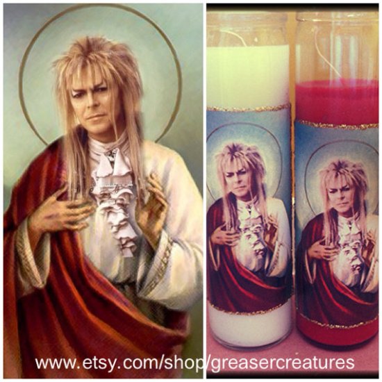 This Jareth/David Bowie prayer candle is by Etsy seller Greaser Creatures, who’s also sanctified Darth Vader, Princess Leia, Elvira, and more.