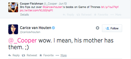 Game of Thrones‘ Carice van Houten, who takes a “gives no f**ks” attitude toward TV nudity, has pretty much the perfect response to a guy’s somewhat, er, enthusiastic reaction to seeing her character’s breasts. (Pajiba)