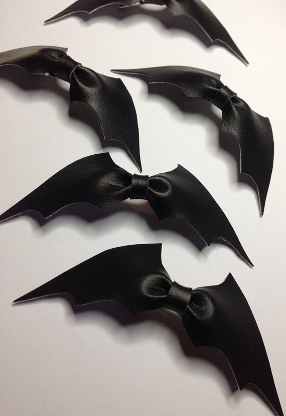 You can wear this leather Batman bow by Etsy seller Dulcecalaveritas either as a hair bow or a necktie. Or both. Just place bats all about your person. (via Boing Boing)