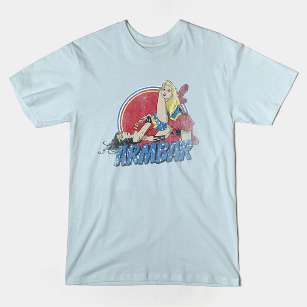 An armbar is a grapple move in wrestling when one hyperextends the elbow or shoulder joint of their opponent, so this should be a really awesome shirt of Supergirl and Wonder Woman engaging in an battle of physical wills. But I don’t know, something about the composition of this shirt makes me uncomfortable for some reason? I think it’s Supergirl’s expression. Thoughts, readers?