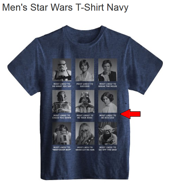 TMS reader, Kirsten McKnight tipped us off to this really disappointing men’s Star Wars shirt from Target featuring Leia as “Most Likely to Be Rescued.” Really? Not “Most Likely to Rule?” or “Most Likely to Be a Senator?” or “Most Likely to Rebel?” Get it together, Target!