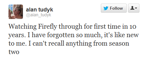 - Alan Tudyk made us all sad and nostalgic about Firefly, again, in 140 characters or less. He also made us giggle. (Twitter)