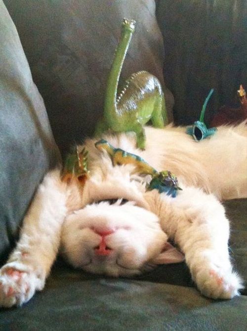 Best way to prank on your sleeping cat, by far, is to cover him or her with dinosaurs. A picture made for the internet. RAWR. (via The Daily What)
